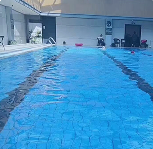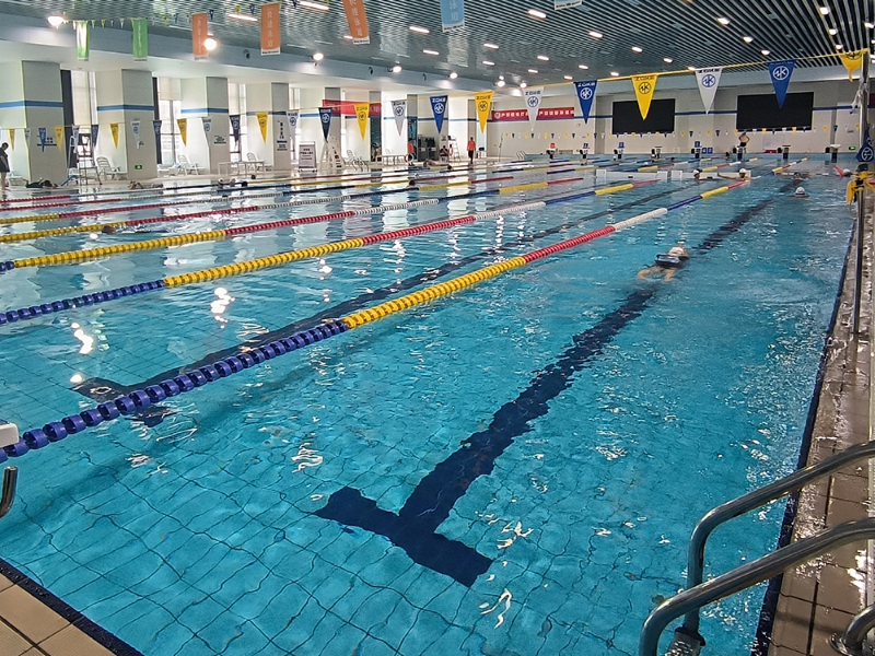 某大学体育馆游泳池,池水清澈透亮,配备先进的泳池水循环和净化系统,实时监测水质,确保安全卫生。…